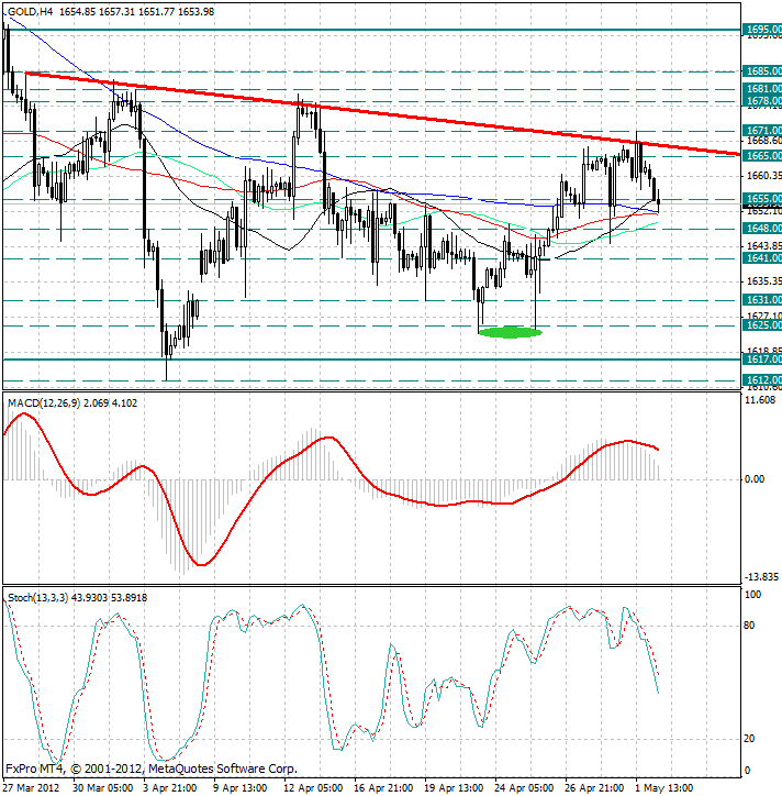 Цена на золото расположена немного выше скользящих средних с периодами 144, 89 и 55, которые являются областью поддержки 1 651-1 649, и в данный момент слилась со средней с периодом 34.