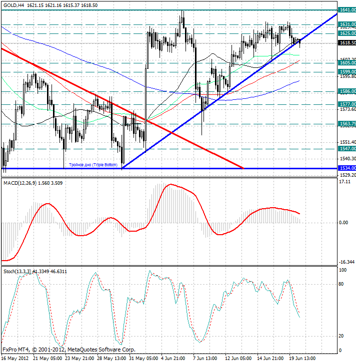 Цена на золото закрепилась ниже скользящей средней с периодом 34 (теперь это уровень сопротивления 1 621), но по-прежнему расположена выше скользящих средних с периодами 55, 89 и 144, которые являются рядом уровней поддержки 1 610, 1 606 и 1 593.