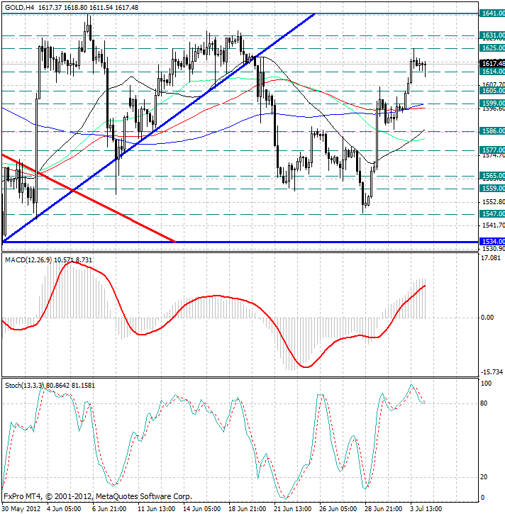 Цена на золото расположена выше скользящих средних с периодами 144, 89, 34 и 55, которые являются рядом уровней поддержки 1 599/97, 1 586.50 и 1 582.50.