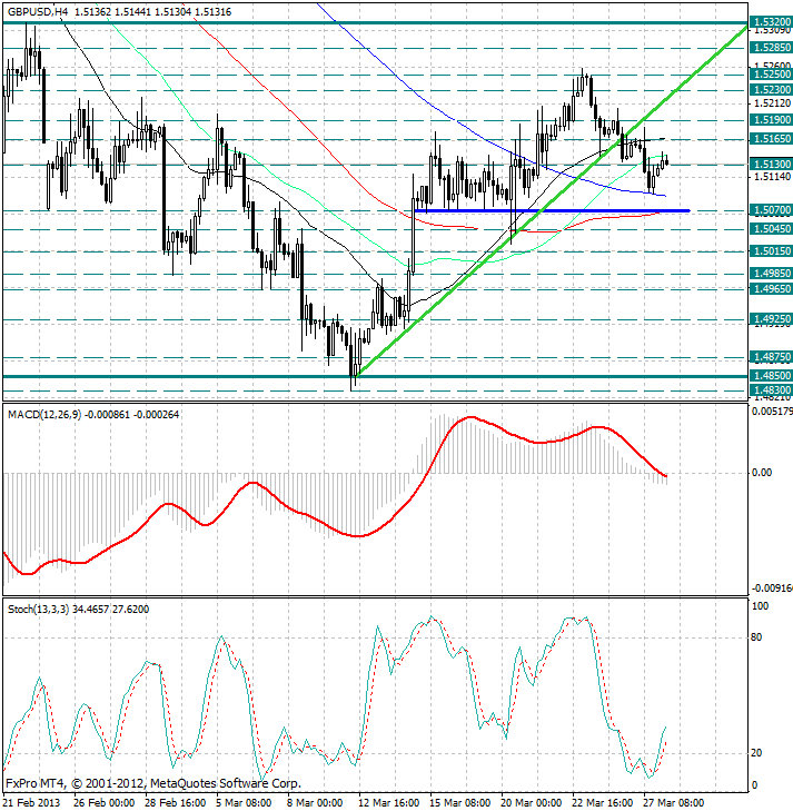Курс валюты зажат между скользящих средних с периодами 55 и 34 (уровни сопротивления 1.5140 и 1.5165) с одной стороны и средних с периодами 144 и 89 (уровни поддержки 1.5090 и 1.5070) с другой.