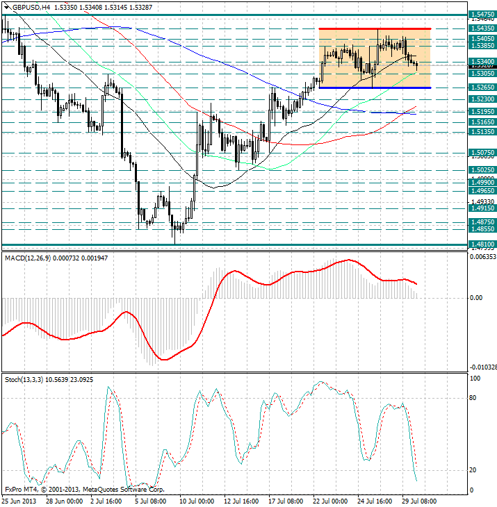 Курс валюты зажат между скользящей средней с периодом 34 (уровень сопротивления 1.5355) с одной стороны и средних с периодами 55, 89 и 144 (ряд уровней поддержки 1.5310, 1.5210 и 1.5185) с другой.