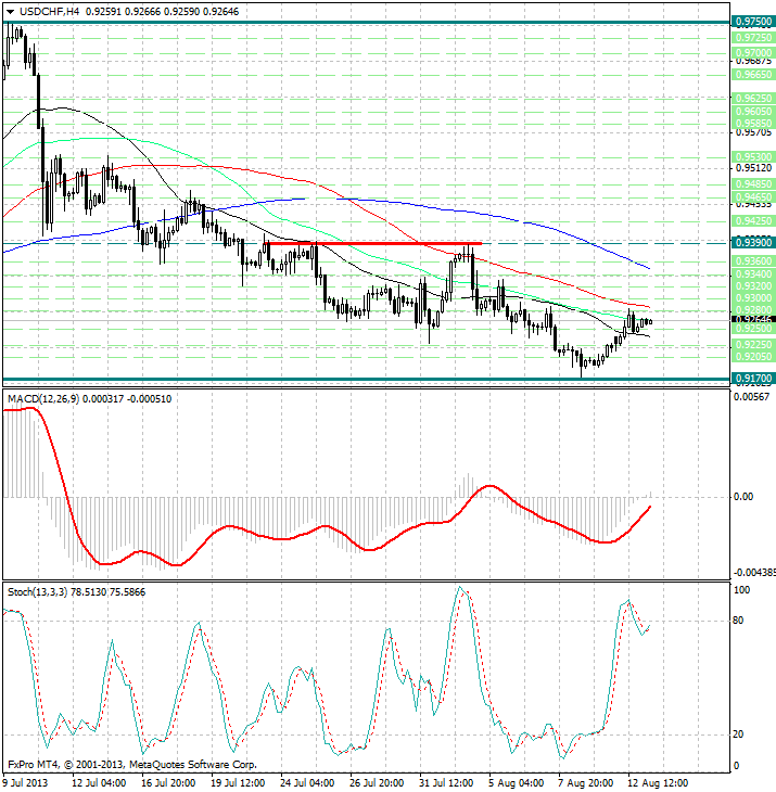 Курс валюты зажат между скользящих средних с периодами 89 и 144 (уровни сопротивления 0.9285 и 0.9350) с одной стороны и средней с периодом 34 (уровень поддержки 0.9240) с другой, и в данный момент слился со средней с периодом 55.