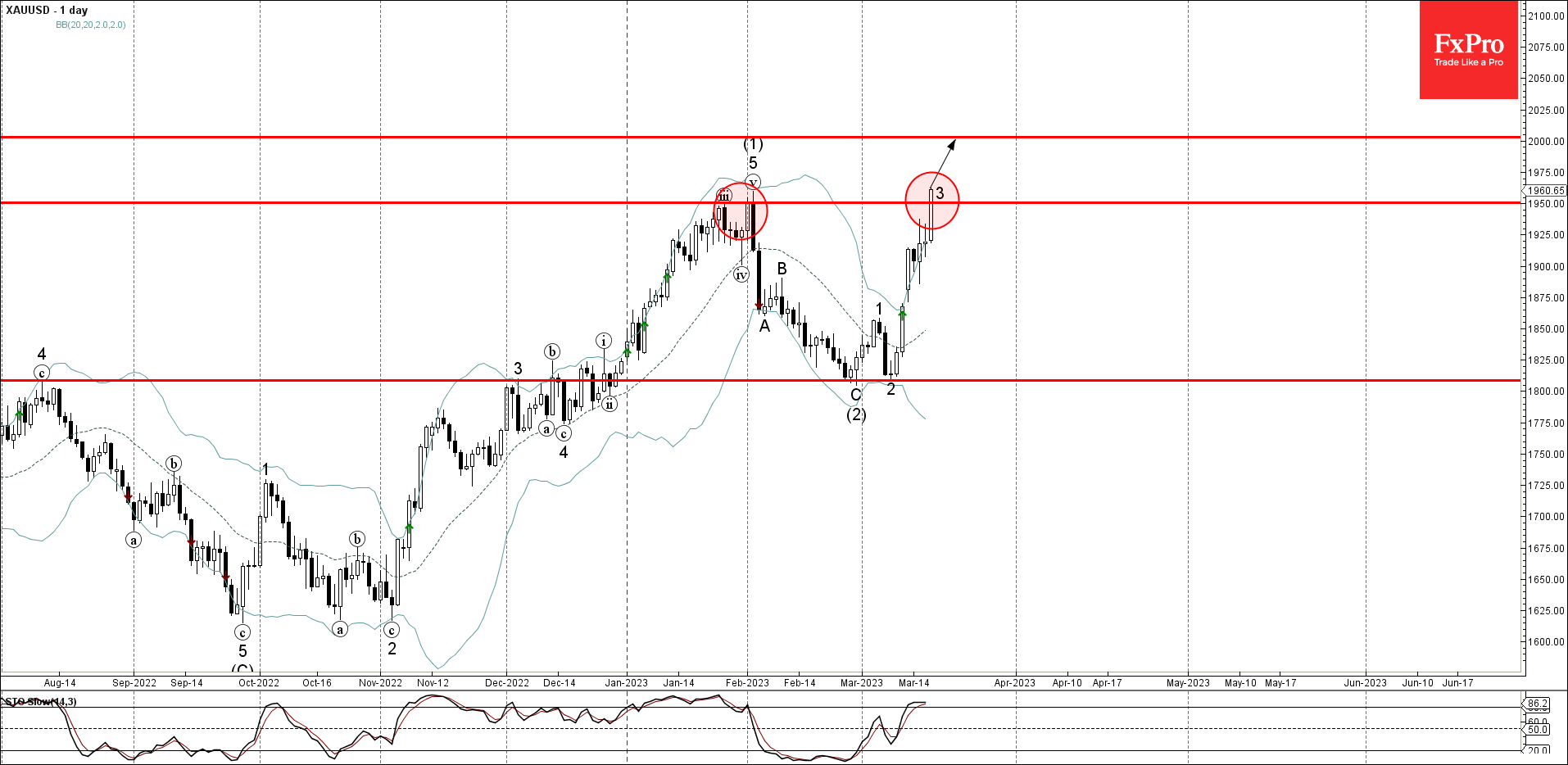 Прорыв уровня сопротивления 1950.00 должен усилить бычье давление на Золото и еще больше ускорить активные импульсные волны 3 и (3).