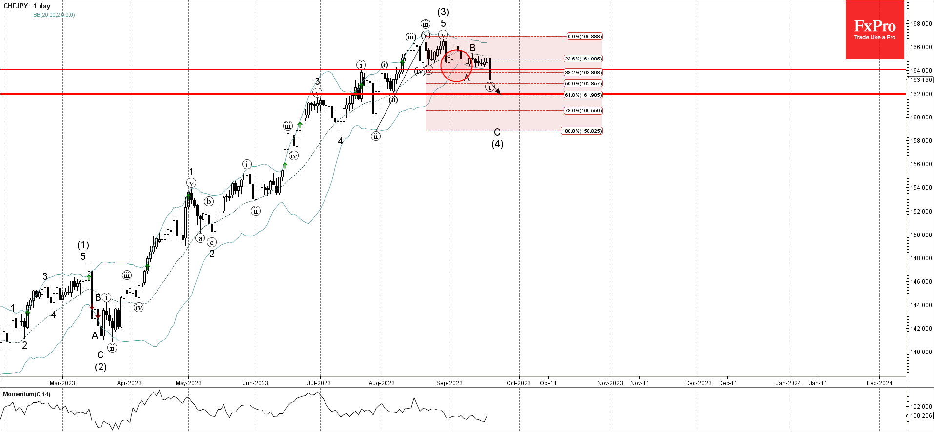 Можно ожидать, что CHFJPY продолжит падение к следующему уровню поддержки 162,00 (дно предыдущей коррекции ii от августа).