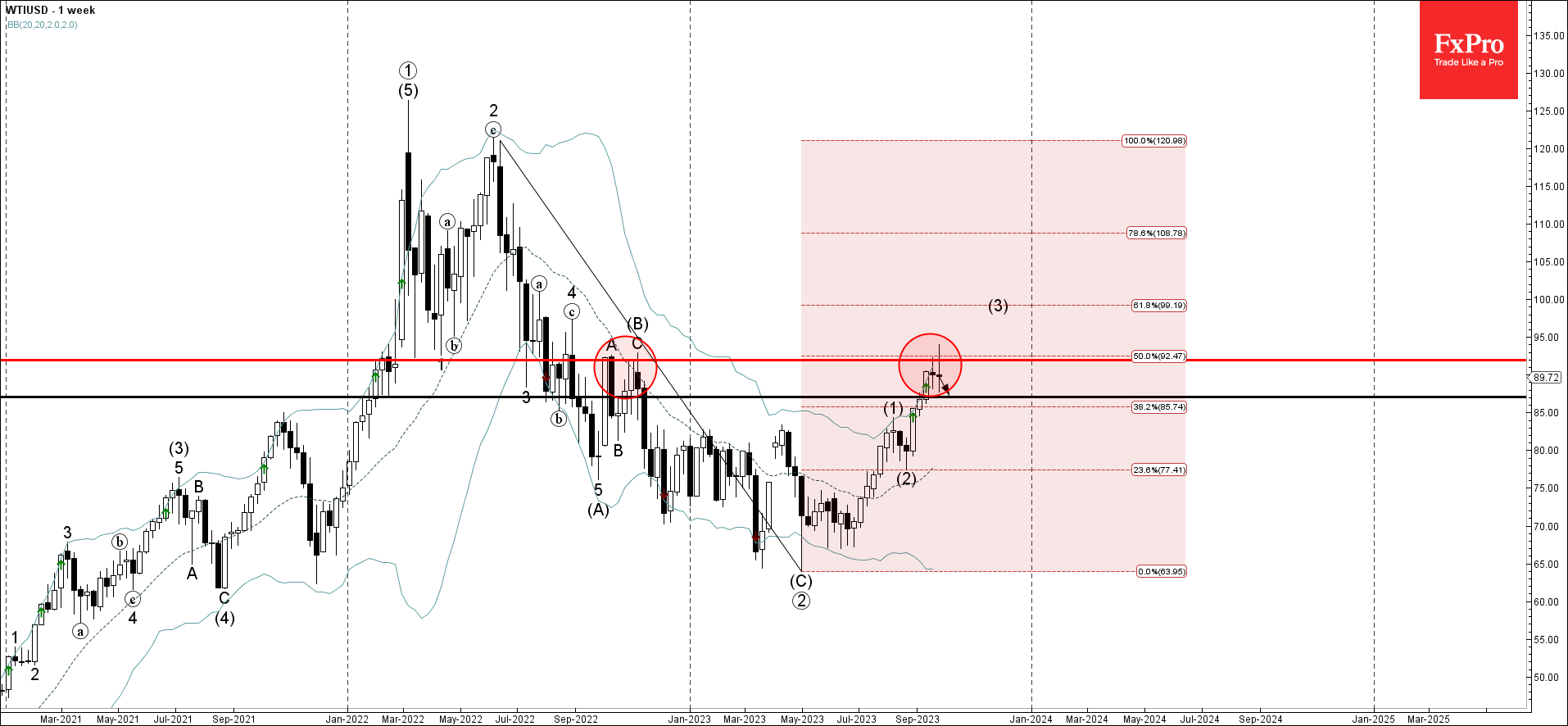 Сырая нефть марки WTI развернулась вниз от ключевого уровня сопротивления 92,00 (который дважды сильно развернул цену в конце 2022 года), пересекающегося с верхней недельной полосой Боллинджера и 50% коррекцией Фибоначчи нисходящего тренда от середины прошлого года.