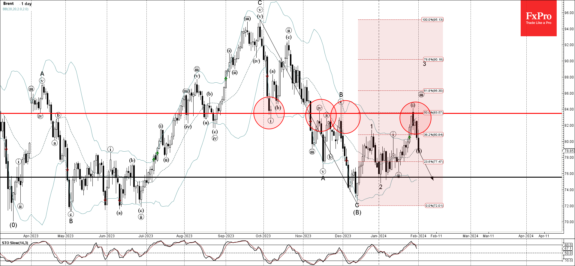 Можно ожидать дальнейшего падения Brent до следующего уровня поддержки 76,00 (дно волны 2 от начала декабря).