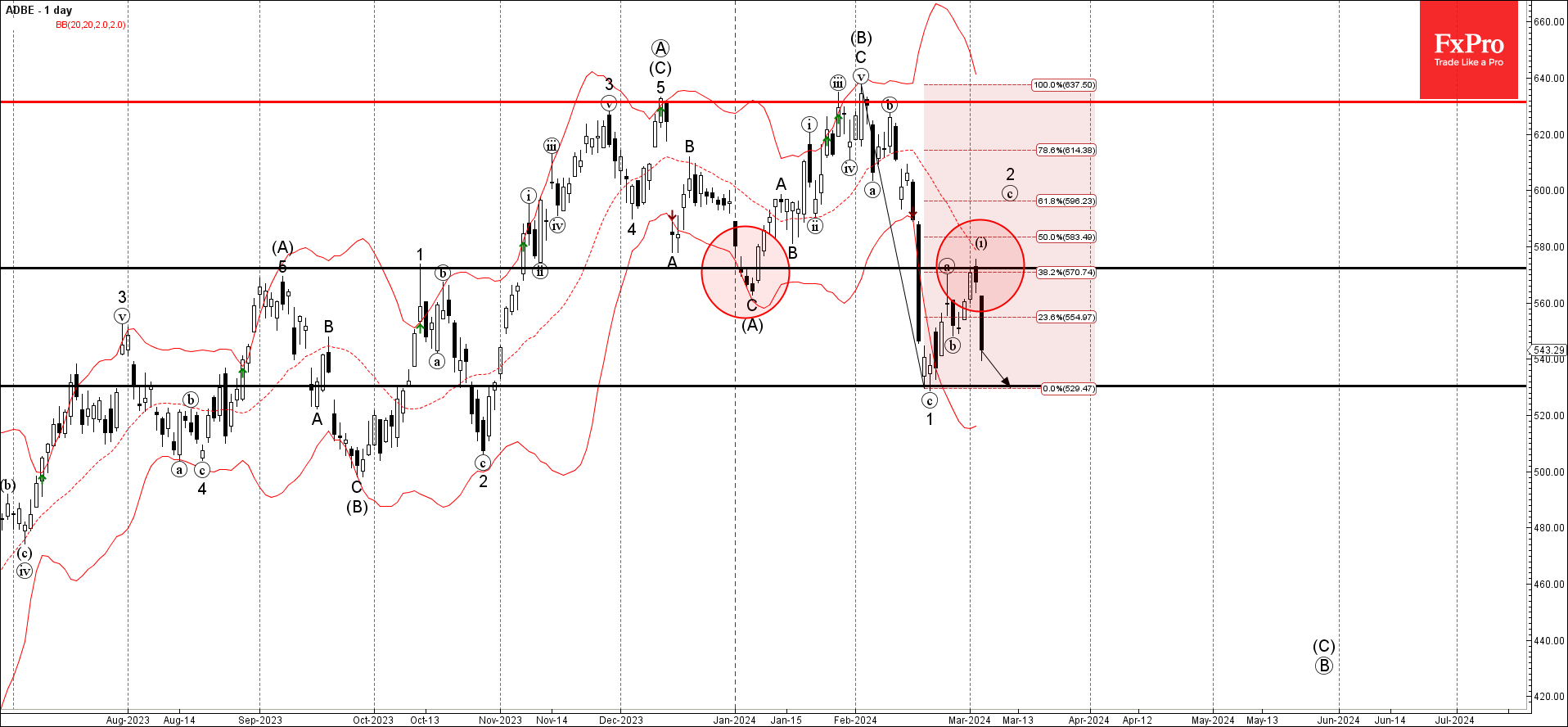 Можно ожидать, что Adobe продолжит падение к следующему уровню поддержки 530,50 (который остановил предыдущую импульсную волну 1 в прошлом месяце).
