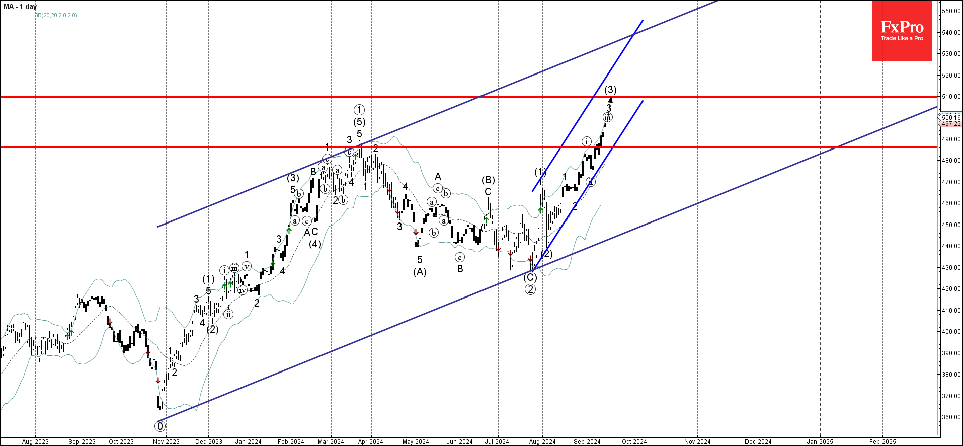MasterCard продолжает расти внутри ускоренной импульсной волны 3, которая ранее прорвала долгосрочный уровень сопротивления 485,00 (который остановил недельный восходящий тренд в марте).