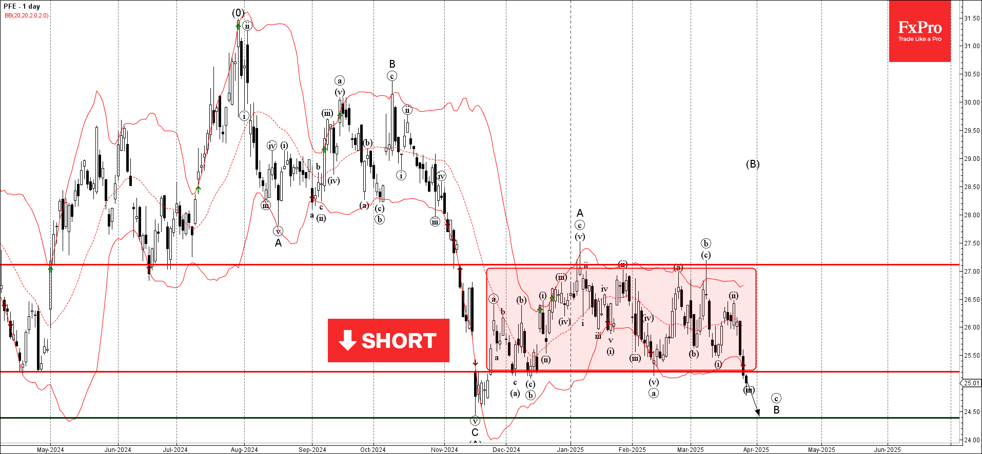 Учитывая сильный дневной нисходящий тренд, можно ожидать, что Pfizer упадет до следующего уровня поддержки 24,70 (бывшая сильная поддержка от ноября и цель для завершения активной волны B).