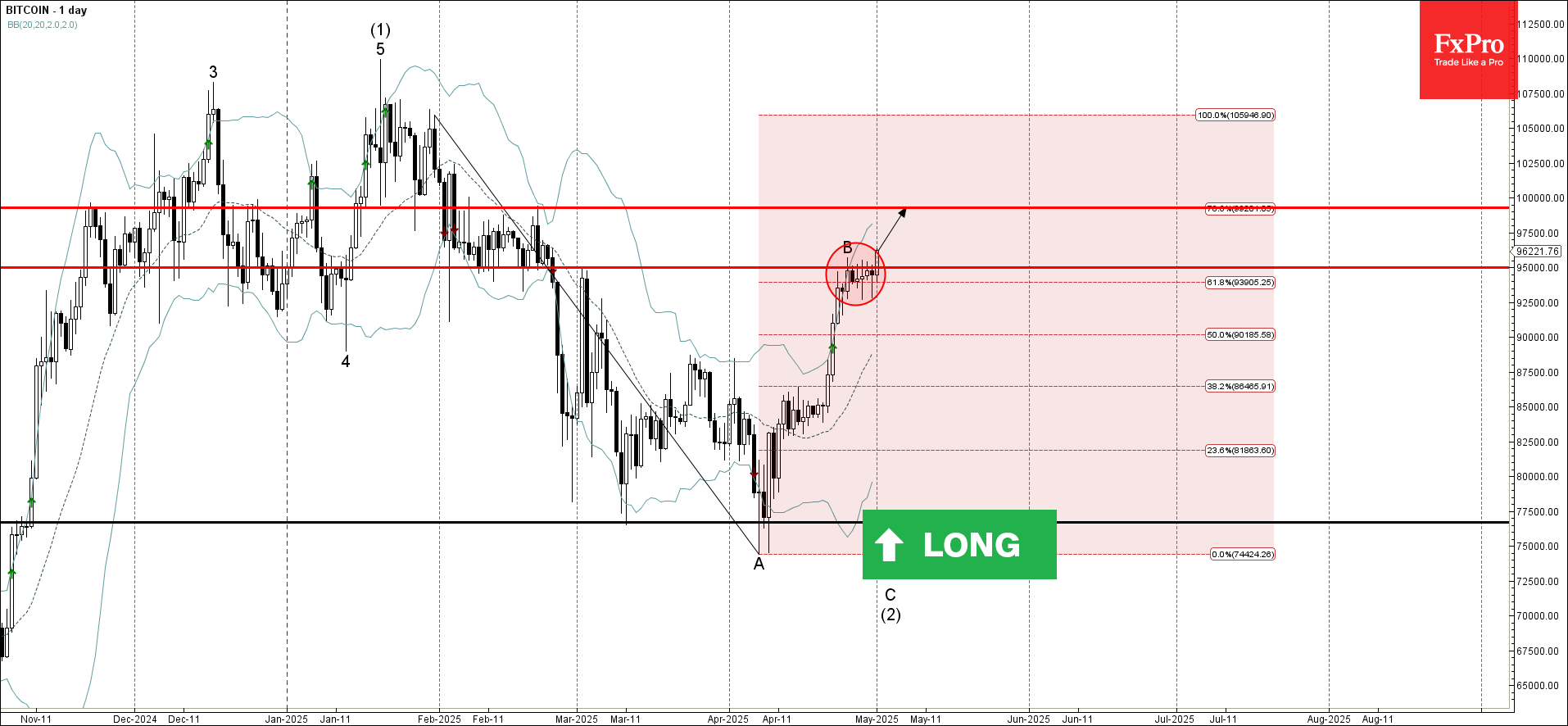 Bitcoin недавно пробил зону сопротивления между ключевым уровнем сопротивления 95000,00 (который остановил предыдущую волну B в конце апреля) и 61,8% коррекцией Фибоначчи нисходящего импульса от января.