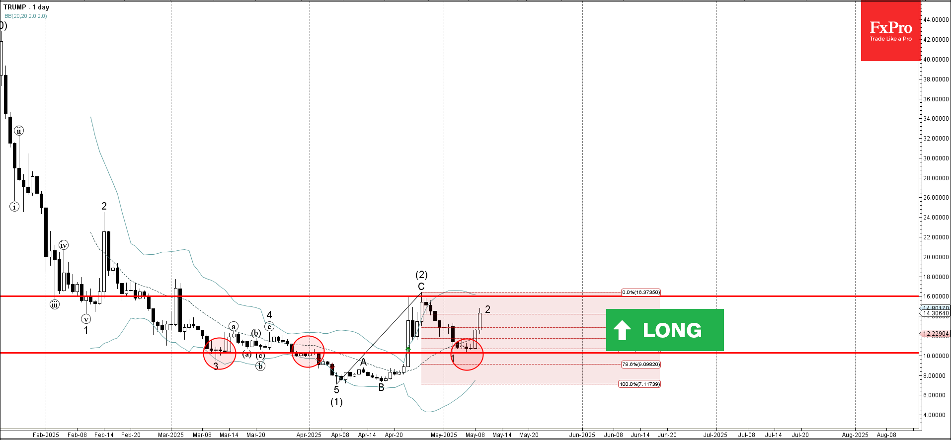 Можно ожидать, что Trump Coin продолжит рост до следующего уровня сопротивления 16.000 (который развернул предыдущую коррекцию (2) в конце апреля).
