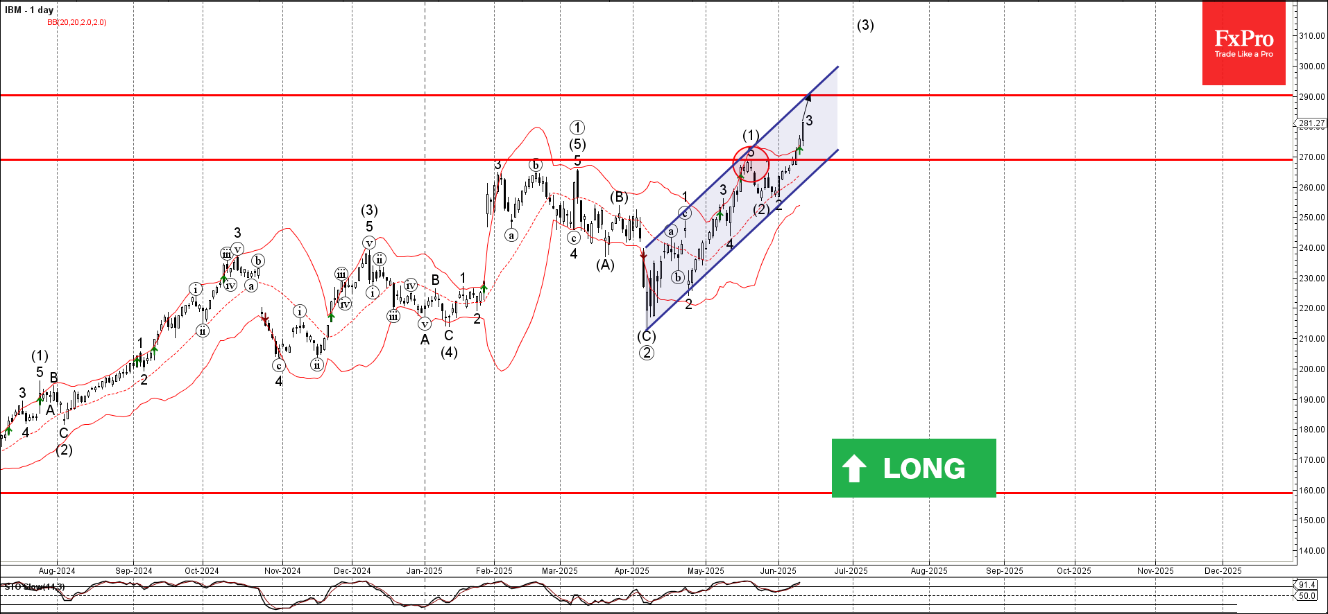 IBM прорвал ключевой уровень сопротивления 270,00 (который остановил предыдущую импульсную волну (1) в середине мая).