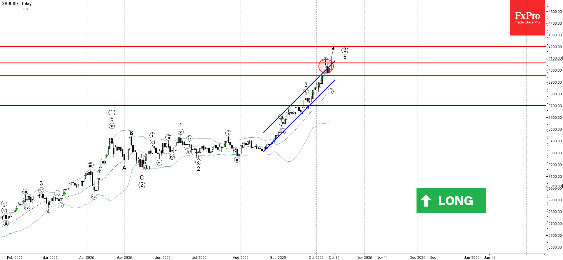 Учитывая сильный дневной восходящий тренд, можно ожидать роста золота до следующего уровня сопротивления 4200,00 (цель для завершения активных импульсных волн 5 и (3)).