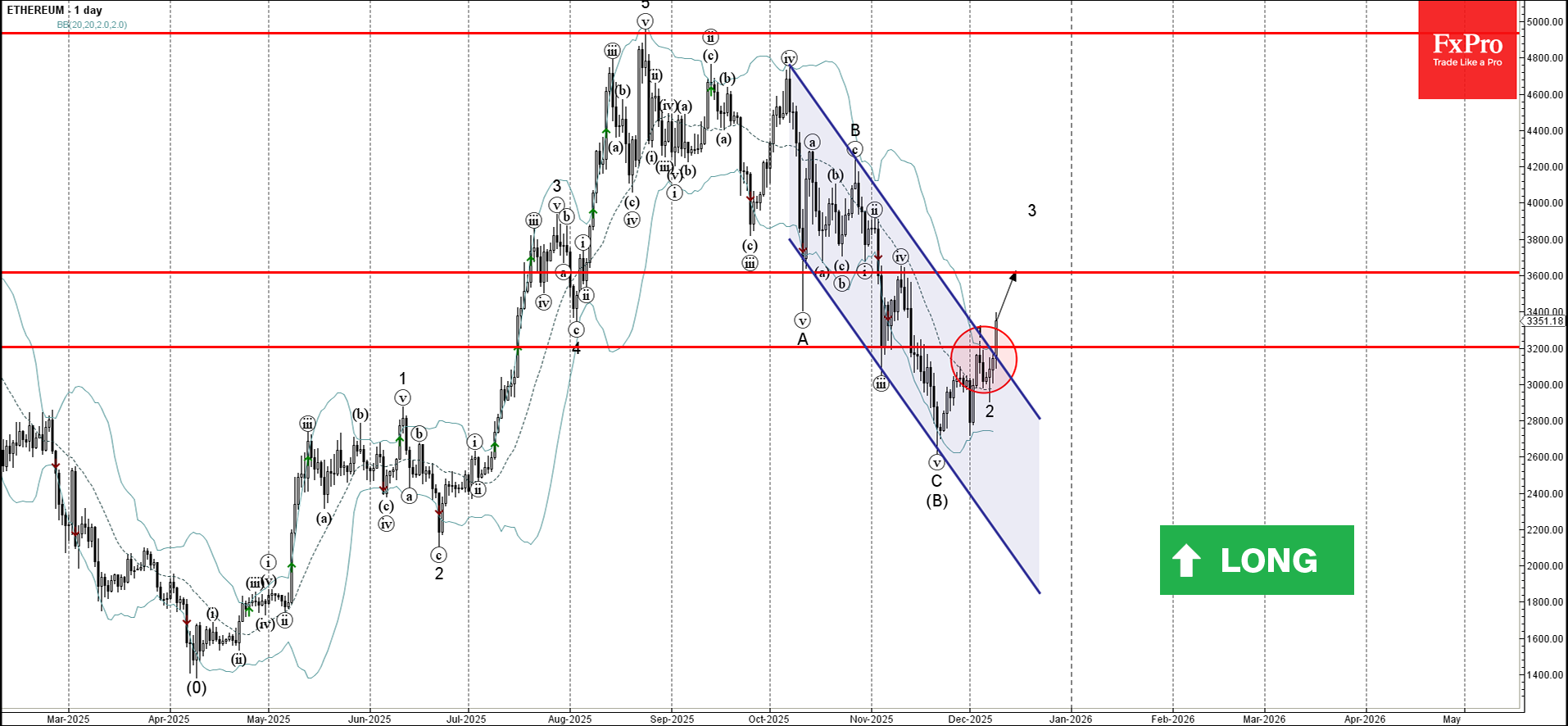 Криптовалюта Ethereum недавно прорвала зону сопротивления между уровнем сопротивления 3200,00 (который остановил предыдущую импульсную волну 1) и линией сопротивления дневного нисходящего канала от октября.