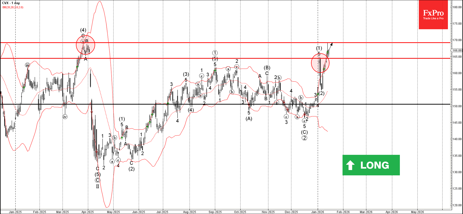 Chevron прорвал сильный уровень сопротивления 165,00 (который остановил предыдущую импульсную волну (1) в начале января).
