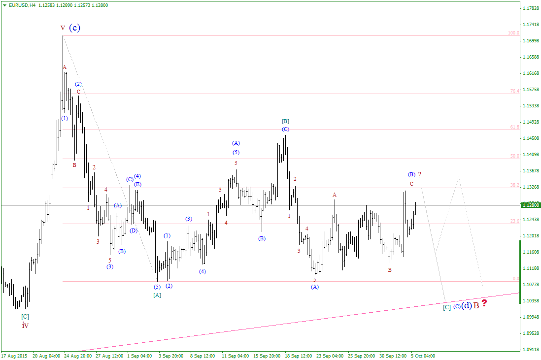 Складывающаяся при этом волновая ситуация позволяет предполагать, что волна [C], в (d), в составе принимающей форму диагонального треугольника волны B, значительно усложнила свою волновую структуру а ее волна (В) начала приобретать признаки более сложной и протяженной коррекции. Если это так, то в процессе дальнейшего развития волновой структуры волны (В), в [C], в (d), цена продолжит движение между отметками 1,1150-1,1350.