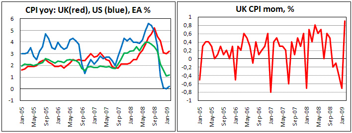 Индекс потребительских цен (CPI) Великобритании ускорил темп роста в феврале до 3,2%, хотя ожидалось его снижение к 2,6% с уровня в 3,0% в январе. Основной вклад в ускорение роста цен внесло подорожание продуктов питания и безалкогольных напитков. Мы уже не раз отмечали эту тенденцию во всем мире, но в Великобритании рост цен в этой группе, пожалуй, максимальный из-за падения стерлинга. Снижение курса национальной валюты называется главой Банка Англии причиной, по которой инфляция может оставаться довольно волатильным показателем в ближайшие месяцы. На графике видно, что возобновление повышательной тенденции по итогам февраля отмечено также и в США и в еврозоне, но при этом темп роста в Великобритании выше на 2 и 1 процентный пункт соответственно, что как раз и вызвано более падением gbp и мощным ростом цен на импорт. Но здесь необходимо заглянуть вперед и сравнить, какой была динамика годом ранее. Тогда инфляционный всплеск начался в апреле и достиг своего пика в сентябре. Проходило это на фоне невероятного всплеска цен на нефть и стремительного падения курса британской валюты. В настоящий момент ожидать столь же масштабного роста стоимости черного золота не приходится, а это дает повод ожидать, что динамика этого года будет намного слабее прошлогодней. Предвидя это, Банк Англии уже начал печатать деньги для выкупа корпоративных и государственных долгов, что является также негативным моментом для стерлинга в среднесрочной перспективе, но при этом дает более высокие, чем ожидалось, показатели CPI приводят к росту фунта. Положительным на сегодня является также и взлет акций финансового сектора, с которым плотно коррелирует британская валюта.