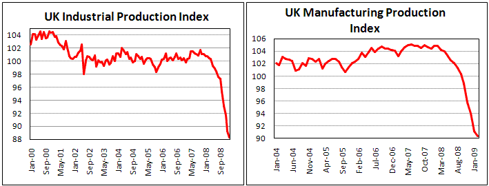 Промышленное производство в Великобритании сократилось на 1,0% за февраль. Сокращение в обрабатывающих отраслях за последние три месяца составило 6,5%, что является антирекордом за весь период сбора подобной статистики с 1968 года. Падение объемов производства происходит 12-й месяц подряд, чего не наблюдалось с 1980 года. Мы видим, что темп падения сократился, но негативная динамика продолжает сохраняться. Банку Англии придется продолжить свою политику, направленную на расширение предложения денег в стране. Хотя многие сейчас ожидают, что BOE ничего не предпримет в ходе заседания на этой неделе, все же увеличивается вероятность более серьезных действий в будущем. Экономика Великобритании рискует стать одной из самых пострадавших в ходе кредитного кризиса, что ослабляет перспективы фунта в среднесрочной перспективе. К тому же из заявлений чиновников легко читается желание ослабить курс национальной валюты для поддержания уровня инфляции и местных производителей. После релиза стерлинг сохранил устойчивость, несмотря на разочаровывающую статистику, укрепляясь к европейским валютам и снижаясь намного меньше многих к доллару. Причиной такой устойчивости стало то, что экономисты ожидали еще большего падения уровня производства, приблизительно на 1,5%. К тому же рынок ожидает решения по ставке, избегая сильных движений на макроэкономических новостях до этого момента.
