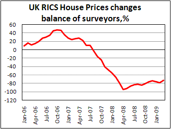Опубликованный сегодня опрос от британской Royal Institution of Chartered Surveyors показал некоторые улучшения в сфере продаж жилой недвижимости. Основной индикатор вырос в марте до -73,1 против -78,3 месяцем ранее. Это означает, что тех, кто ожидает снижения цен в ближайшие месяцы на 73,1% больше, чем тех, кто ждет роста. Это очень слабые показатели, но при этом они заметно выше того, что наблюдалось 11 месяцев назад, когда индикатор достиг своего минимума в -94,7. В обзоре также отмечается рост спроса со стороны новых клиентов, что и стало основной положительной новостью, так как означает, что некоторые участники считают жилье достаточно подешевевшим. Статистика рынка жилья имеет сильное влияние на динамику финансового сектора, а тот в свою очередь влияет на курс британской валюты. Мы видим, что отчеты многих финансовых компаний превосходят прогнозы, увеличивая спекуляции на тему, что самые трудные времена для банков пройдены. Позитивные моменты рынка жилья и неплохие отчеты финансовых компаний вызвали покупки стерлинга против доллара, евро и иены. Скорее всего, значительная часть оптимизма развеется еще до конца недели, так как очевидно, что рынок зашел слишком далеко в позитивной оценке восстановления финансового сектора. Снижение проблем с ликвидностью еще не означает устойчивый рост доходов финансовых компаний.