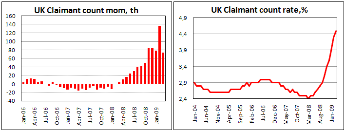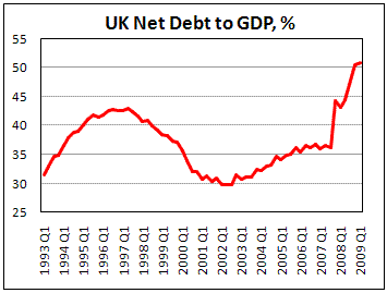 Среда стала важным днем для Великобритании. Сегодня мы получили целый ряд данных по бюджету, а также имеем свежие новости с рынка труда. За март прирост числа безработных оказался почти вдвое ниже показателей февраля и заметно лучше прогнозов, составив 73,7 тысяч. Тем не менее, это не помешало обновить максимум по уровню безработных за 12 лет. Эта статистика обычно имеет серьезное влияние на рынок, но сегодня хотелось бы обратить внимание на уровень доходов. Этот показатель за последние три месяца сократил прирост к предшествующему году до 0,1% с 1,7% месяцем ранее. Это был неприятный сюрприз, так как ожидалось сокращение лишь до 1,4%. Таким образом, доходы британцев в марте серьезно сократились, что делает неизбежным еще более глубокое падение потребительской активности в ближайшие месяцы. Одновременно стало известно о том, что дефицит бюджета Великобритании вырос до максимального значения за послевоенную историю, утроившись за 12 месяцев. На графике внизу видно, как с конца 2007 года вырос долг в соотношении к ВВП страны. Первой причиной взлета долга стала национализация Northern Rock. А позднее события развивались очень стремительно, повесив на баланс падение доходов, еще несколько банков и программы по стимулированию экономики. Сейчас расходы превышают доходы на 90 млрд. фунтов стерлингов, против ноябрьских обещаний правительства в 77,6. Но наиболее важной новостью, обвалившей стерлинг, стало сообщение о том, что правительство займет 269 млрд. фунтов стерлингов, из них 175 в этом году или 12,4% от ВВП. Это огромные суммы, намного превышающие ожидания и оказывающие значительное давление на британскую валюту. При этом премьер указал, что ожидает начала восстановления экономики уже в конце этого года благодаря предпринятым и объявленным мерам. Прогноз обещает падение ВВП на 3,5% в 2009, рост на 1,25% в 2010 и 3,5% в 2011. Многие весьма обоснованно говорят о чрезмерном оптимизме подобных прогнозов.
