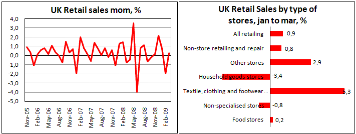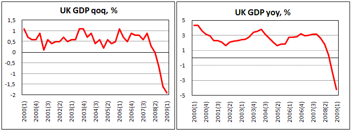 ВВП Великобритании сократился по итогам первого квартала 2009 года на 1,9%, сообщило сегодня официальное статистическое агентство страны. Годовое снижение составило 4,1%, что стало худшим результатом за последние 30 лет, оказавшись хуже прогнозов, предполагавших падение на 3,8%. Падение по итогам квартала наблюдается как в производственных отраслях, так и в сфере услуг. Обрабатывающие отрасли демонстрируют очень слабую динамику, показав сокращение сразу на 6,2%. Сфера услуг также не смогла избежать спада, потеряв за первые три месяца года 1,2%, что стало третьим к ряду кварталом снижения. Столь слабые показатели экономики подогревают опасения в отношении растущего госдолга Великобритании, что давит на фунт стерлингов. Не спасает его от распродаж и показатели розничной торговли, оказавшиеся лучше ожиданий. По итогам марта увеличение продаж составило 0,3% при ожиданиях снижения на такую же величину. К показателям марта 2008 года, этот год прибавил 1,5%, против прогнозируемых 1,1%. Стерлинг находится также под давлением на фоне рисков по поводу прохождения стресс-тестов американскими банками. Имея очень высокую корреляцию с акциями финансового сектора, британский фунт снижается даже к американскому доллару, который выглядит сегодня очень ослабленным.