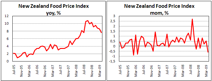 Индекс цен на продукты питания в Новой Зеландии упал в апреле на 0,6%, а годовой темп роста цен сократился до 7,6% с 8,6% месяцем ранее. Подобное снижение вызвано сезонным падением цен на фрукты, хотя по итогам года именно эта группа демонстрирует внушительный рост в 21,3%. Мы отмечали, что составляющая продуктов питания во многом способствует сохранению общего индекса потребительских цен на довольно высоком уровне во многих странах. Товары этой группы росли вместе с ценами на нефть, но избежали столь же глубокой коррекции во втором полугодии 2008, какая наблюдалась на сырьевых рынках. Тем не менее, дальнейшие прогнозы могут быть более сдержанными. На фоне снижение потребительской активности, стоимость продуктов питания может оказаться под давлением, что будет способствовать замедлению инфляции. Тем не менее, восстановление сырьевых площадок будет, напротив, разогревать инфляционные ожидания. Нужно проявлять осторожность в оценке темпов роста цен, так как усиление спроса со стороны спекулянтов (благо «недорогие» деньги получить гораздо легче после массированных программ основных мировых ЦБ) может опережать скорость восстановления потребительского спроса. Это в конечном итоге возвращает нас в 2008 год, когда покупательная способность падала на фоне всплеска инфляции. Все это может существенно усугубить спад и увеличить продолжительность выхода из него. В краткосрочной перспективе, рынок, захваченный эйфорией по поводу «разворота в экономическом цикле» (Трише), вновь обратил взор на рисковые активы, а, следовательно, на сырье и сырьевые валюты. Новозеландский доллар прочно обосновался выше 200-дневной скользящей средней, и если и предпримет попытку протестировать ее сверху, для этого потребуется в ближайшие дни веский повод.