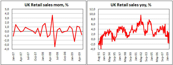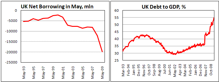 Объем розничных продаж в Великобритании сократился в мае на 0,6%, оказавшись заметно хуже ожиданий рынка, настроившегося увидеть рост в 0,3%-0,4% после увеличения на 0,9% месяцем ранее. К прошлому году объем розничной торговли сократился на 1,6% обновив 17-летний минимум. Лучше других чувствует себя небольшие магазины, а также различного рода ремонтные мастерские. Они за год увеличили объем продаж на 9,8%, однако их вклад оказался вдвое ниже по сравнению с падением продаж в непродовольственных магазинах, где объемы сократились на 3,0%. Продуктовые магазины также фиксируют спад, составляющий 1,3%, что отняло сразу 0,6 проц. пункта от общего индекса. Опубликованная статистика розничных продаж оказала серьезное воздействие на рынки, спровоцировав резкое ослабление стерлинга против широкого спектра валют рынка, хотя слабые данные во многом обусловлены изменением в методике подсчета розничных продаж. О том, что текущие показатели будут несколько слабее, ONS предупреждал еще раньше. Не добавляет оптимизма также и публикация рекордного бюджетного дефицита для мая. Он составил 19,8 млрд. за счет роста расходов, а также увеличения дефицита бюджета. Соотношение долга к ВВП до максимального значения за выборку (с 93 года) в 54,7%. Тенденции в промышленности также не смогли порадовать фунтовых быков, оказавшись ниже прогнозов: -51 против -56 месяцем ранее и ожиданий в -45. Слабая статистика привела к коррекции по фунту. На рынке ходят предположения, что фунт может и далее продолжать снижение по мере ухудшения финансовых показателей страны.
