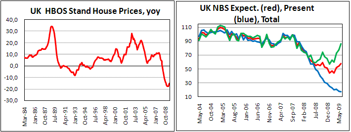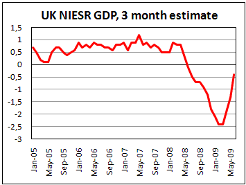 Экономика Великобритании демонстрирует все больше признаков оживления. Согласно отчету NIESR (исследовательского института, в чей круг заказчиков входит и правительство Великобритании) за три месяца, оканчивающиеся в июне ВВП сократился на 0,4%. Месяцем ранее этот показатель составлял -1,3%. Пик спада пришелся на февраль-март после чего наблюдается довольно резкое восстановление. Состояние экономики в настоящий момент оценивается институтом скорее как стагнация, нежели резкое снижение, но при этом накопленное сокращение к прошлому году составило приблизительно 5,2%, согласно оценке NIESR. На графике, где сравнивается время до полного восстановления к докризисным уровням, заметно, что по глубине текущий спад напоминает рецессии 1979-1983г.г или 1929-1934, нежели более мягкий и относительно быстрый спад в 1990-1993 г.г. Но и по сравнению с ним должно пройти еще как минимум около полутора лет прежде чем Британия выйдет на докризисные показатели. Сценарий 30-х и 70-х г.г. предполагает восстановление только через три года. В какой-то степени оправдываются и довольно умеренные прогнозы по рынку жилья. Согласно Halifax, цены на жилье в июне снизились на 0,5%, но годовой темп сокращения все же отодвигается от максимальных темпов спада. В противовес этим предположениям выступает рост индекса потребительской уверенности к 58 п. с 54.