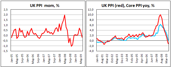 Цены производителей Великобритании потеряли 0,2% в июне, опустившись по отношению к уровням, наблюдавшимся год назад на 1,2%. Данные, как и Германии и Японии ранее сегодня, вышли слабее ожиданий. Причем в Великобритании хорошо заметен рост цен производителей на входе, но их снижение на выходе. В конечном итоге это приведет к падению прибыли компаний, страдающих от ралли энергоносителей в предшествующие месяцы, но при этом по-прежнему имеющих слабые показатели продаж готовой продукции. Опасения вызывает падение стержневого индекса цен, т.е. в котором в расчет не берутся колебания цен на нефть, продовольствие и табак. Этот показатель опустился до 0,1% год-к-году при этом, находясь на уровне 1,2% в мае и 2,5 в апреле. То есть стержневая инфляция находится под угрозой, что может иметь плачевные показатели для потребительских цен (имеется ввиду их заметное падение). Британский фунт на этих данных, а также на снижении основных фондовых индексов (S&P «минусует» 0,75%) оказался под давлением. Вчера пара не дошла до отметки в 1,64 двадцати пунктов. Сейчас более вероятно повторное тестирование 1,60. Нефть по-прежнему слаба, что может стать негативным фактором и для всего рынка, оказав давление на финансовый сектор. Резкое ослабление рубля (-2,5% к доллару за день) можно также трактовать как изменение настроений инвесторов. Фунт на этом также будет терять позиции.